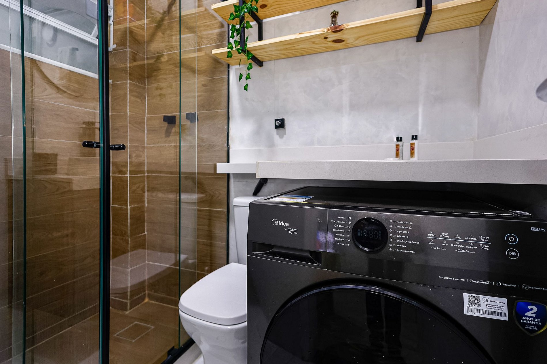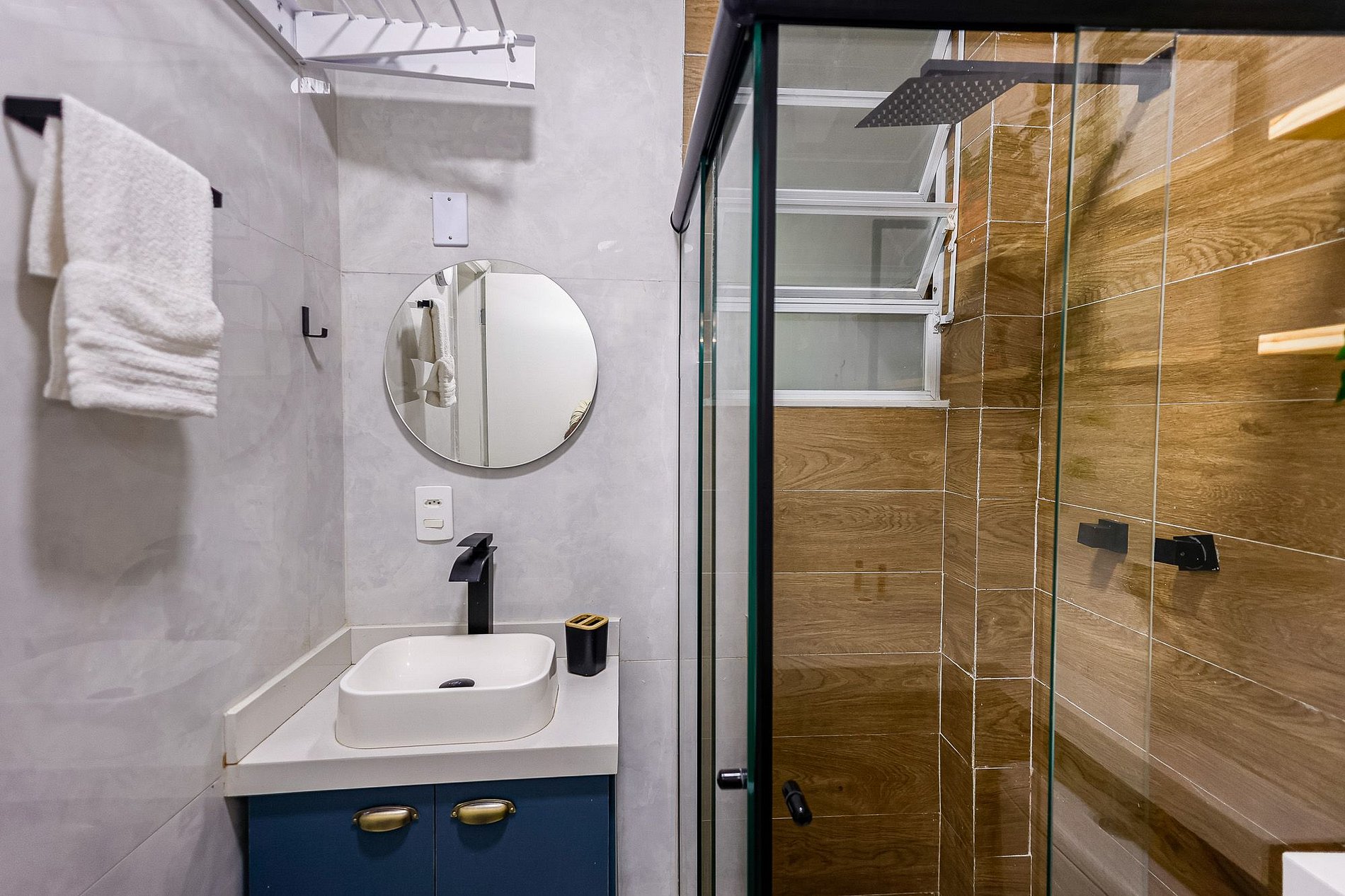 - Banheiro equipado com chuveiro a gás, box de vidro/acrílico, secador de cabelo e produtos de higiene pessoal