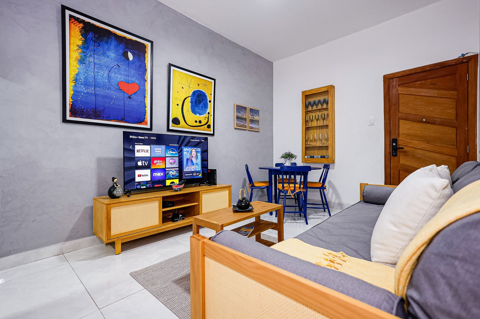 Confortável apartamento com uma suíte, sala com sofá-cama, colchão extra e local para rede em uma pequena varanda.
