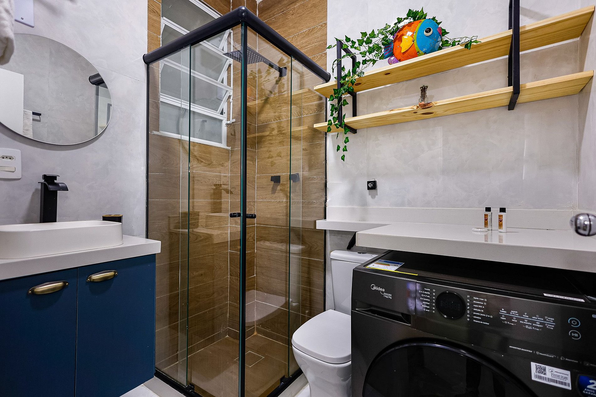 - Banheiro equipado com chuveiro a gás, box de vidro/acrílico, secador de cabelo e produtos de higiene pessoal