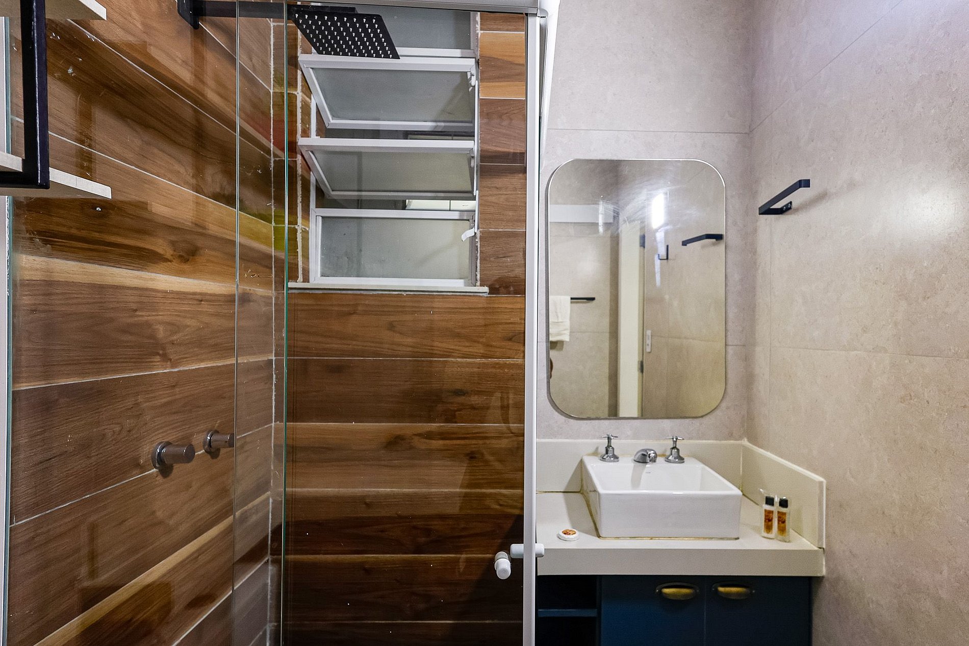 - Banheiro equipado com chuveiro a gás, box de vidro/acrílico, secador de cabelo e produtos de higiene pessoal