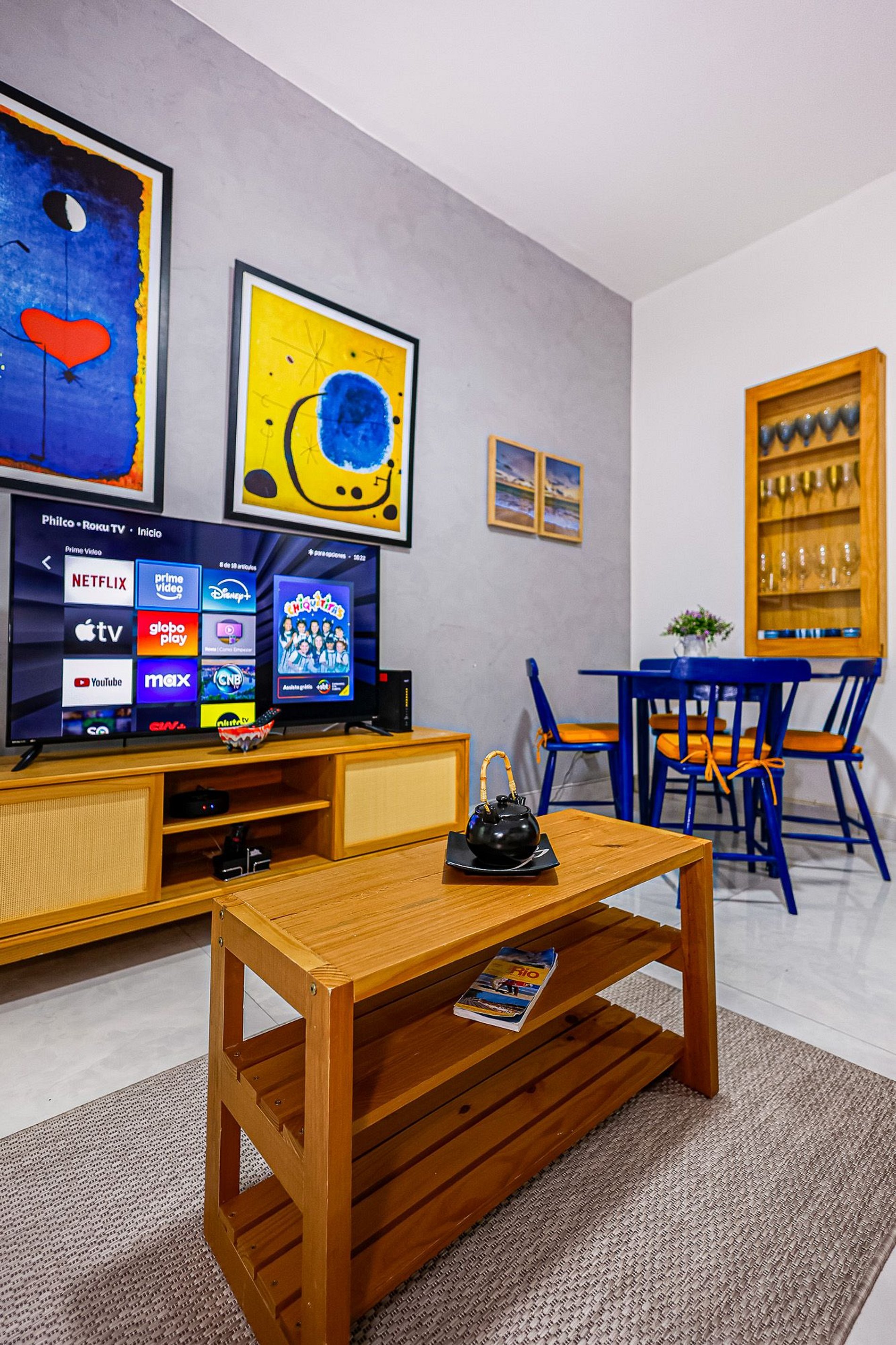 Confortável apartamento com uma suíte, sala com sofá-cama, colchão extra e local para rede em uma pequena varanda.