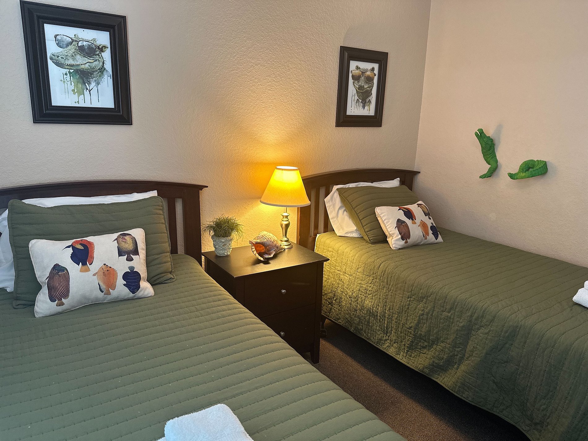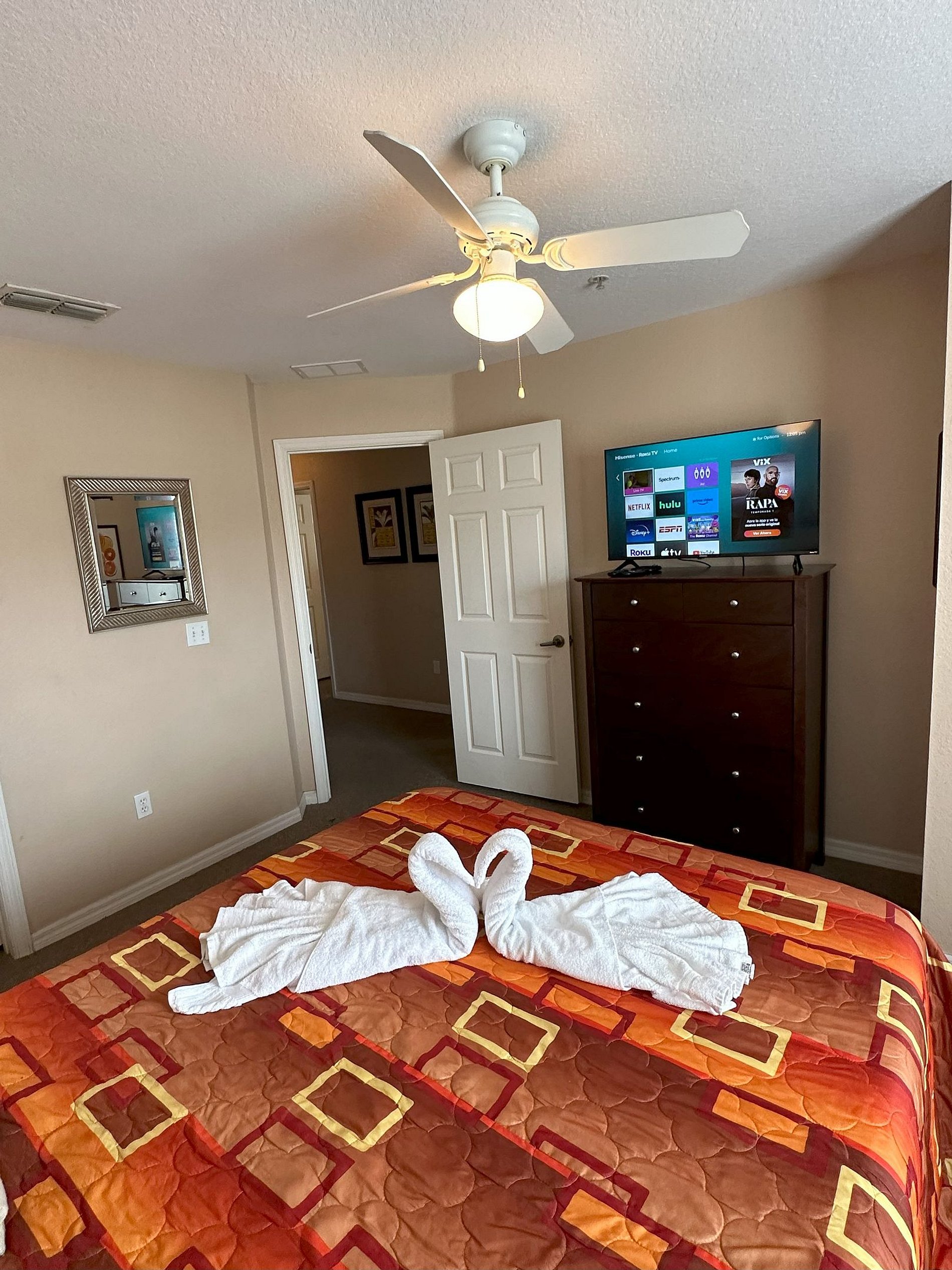 Seja bem-vindo à nossa casa de 4 quartos, projetada para atender a todas as necessidades da sua família. O primeiro quarto, uma suíte no térreo, oferece praticidade para idosos ou pessoas com dificuldades de locomoção, com uma cama de casal e um banheiro equipado com chuveiro. A segunda suíte possui uma cama queen e uma relaxante banheira. Os outros dois quartos oferecem vistas espetaculares - um deles com duas camas de solteiro com vista para o lago, enquanto o outro tem tambem duas camas de solteiro, uma vista incrível para o clubhouse e ainda conta com um fliperama de Pac-Man.