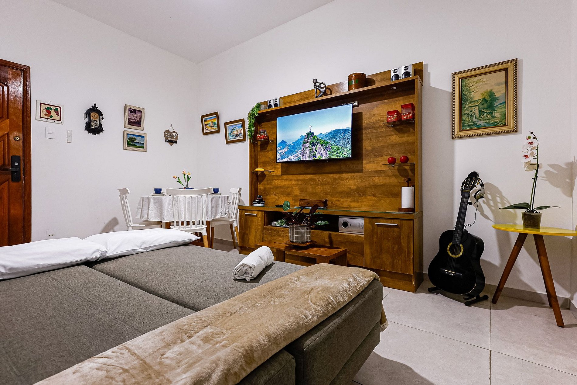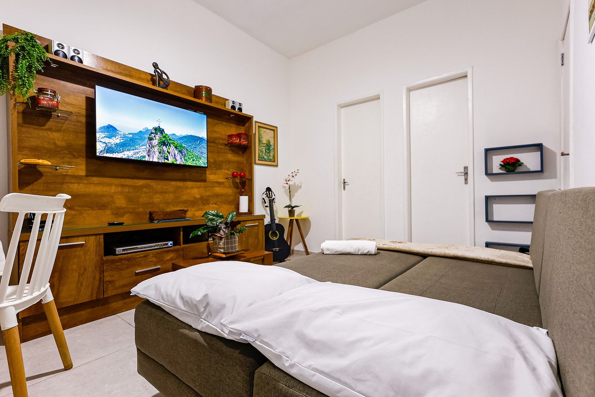 O quarto possui uma cama de casal e a sala dispõe de um sofá-cama, podermos fornecer um colchão extra, se necessário.