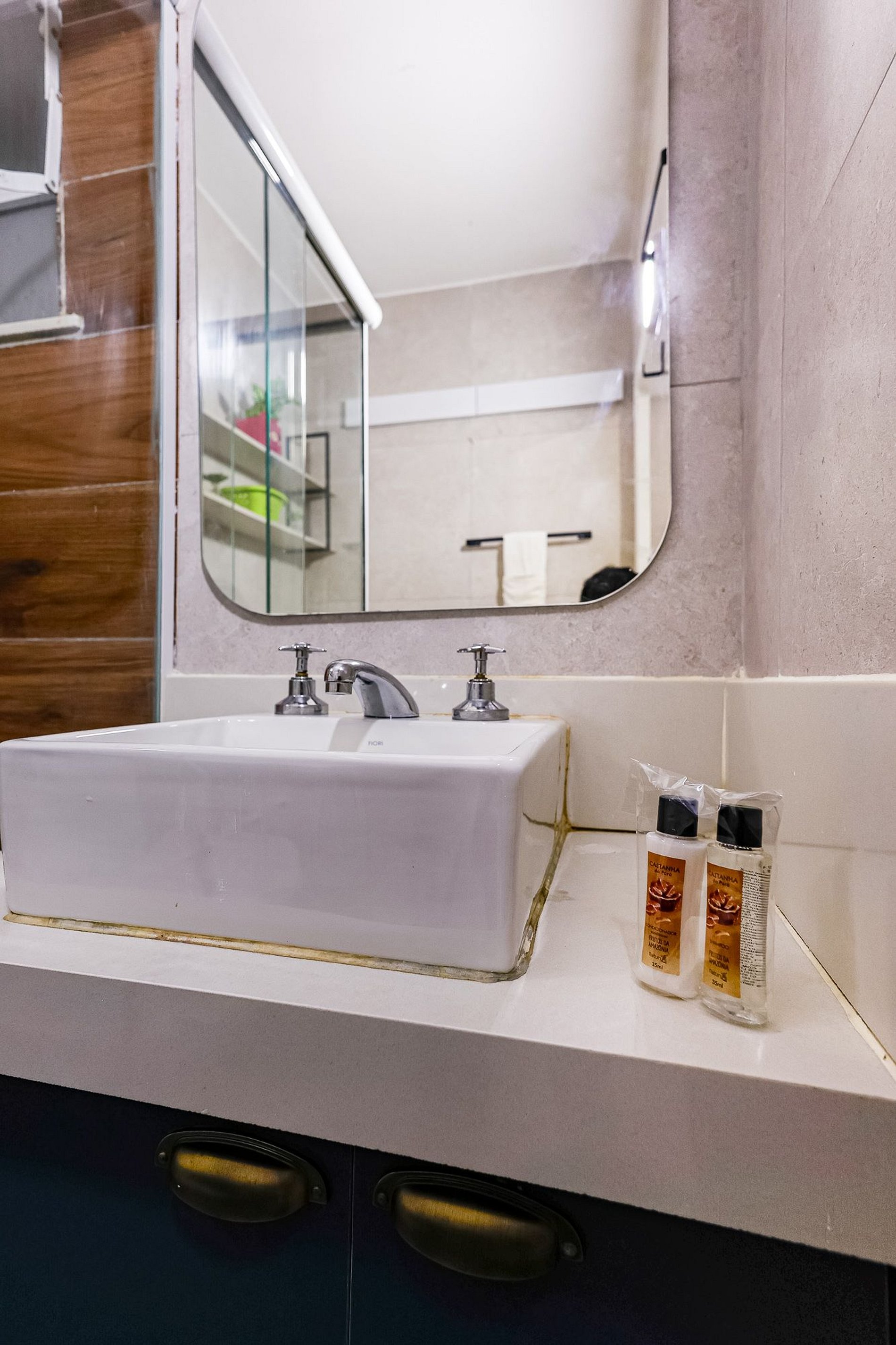 - Banheiro equipado com chuveiro a gás, box de vidro/acrílico, secador de cabelo e produtos de higiene pessoal